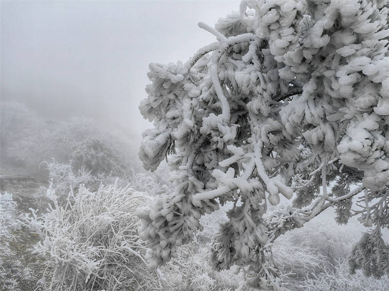 雾凇是泰山十大自然奇观之一,由于泰山海拔较高,潮湿气流缓行过山抬升冷却成雾,在运动中触及树枝、屋顶、岩崖时冻结成为冰粒,形成雾凇奇观。