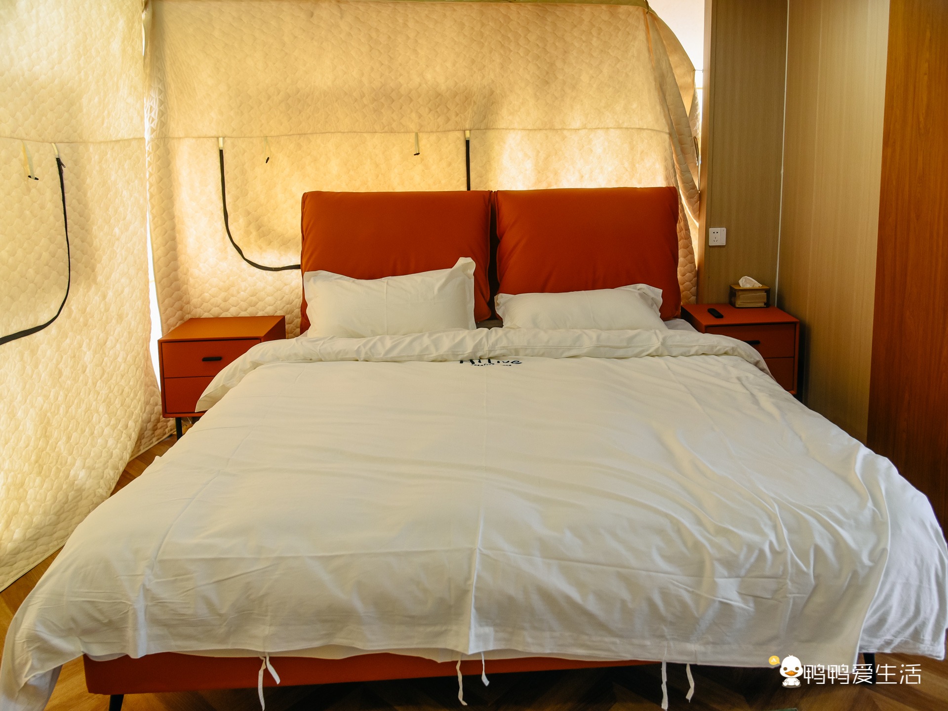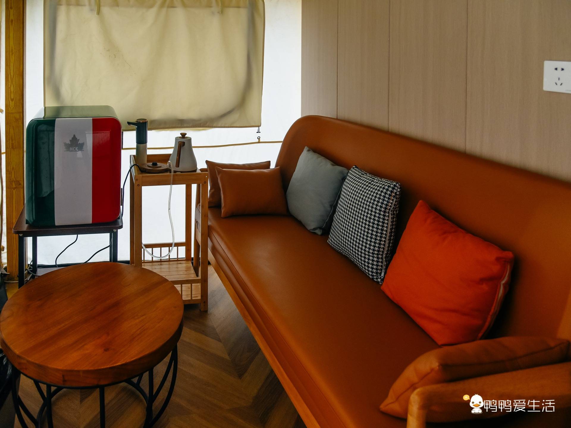 麻雀虽小,五脏俱全,本以为这种条件的住宿可能不会很好,没想到进入里面,设施还很齐全。有个户外的泡茶区,太师椅摇啊摇可太舒服了。帐篷是双层门帘,可以卷起来更透气。入门有个茶水台,上下两间房均带有空调和空气净化器。马桶还是智能马桶,水龙头都是冷热水供应。