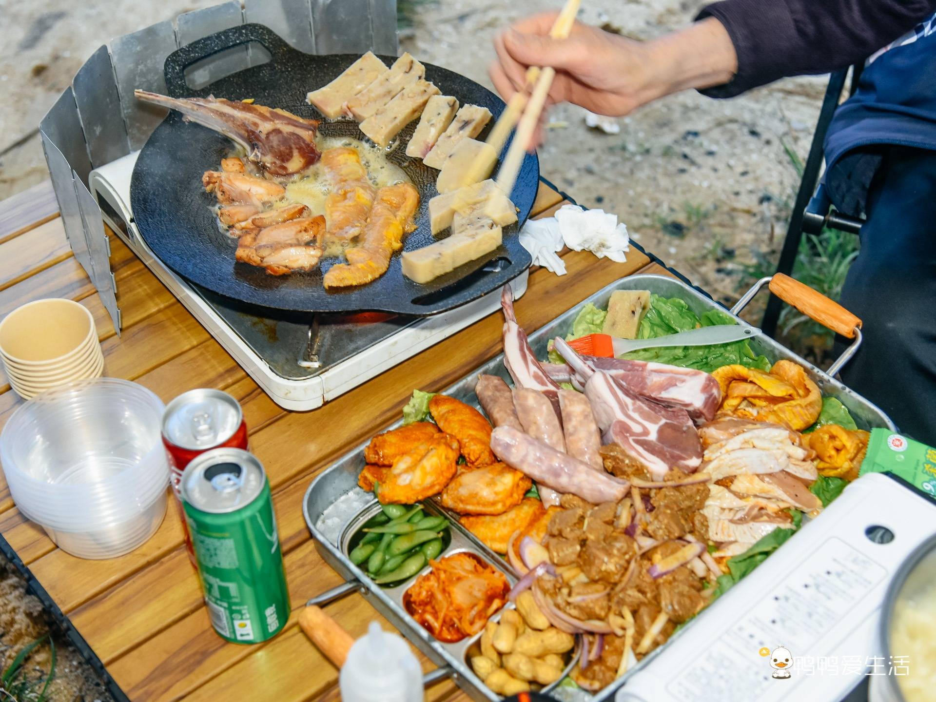 夜幕降临,在天幕帐篷下吃一个露天烤肉,看准备的这一大盘各种肉类,有羊排、鸡翅、牛肉粒等等,还有一个蔬菜拼盘,够一家子吃呢!