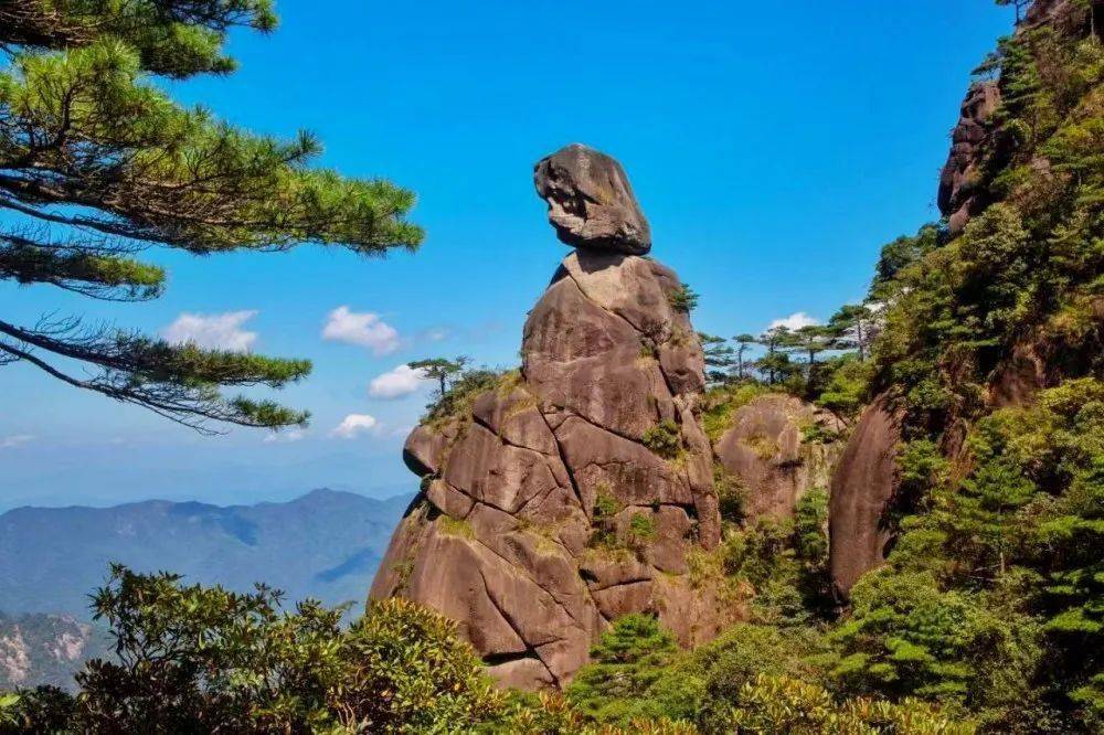 巨蟒出山位于三清山南清园景区内,与东方女神遥遥相望,也是三清山的三大绝景之一。它是一根天然的巨型花岗岩石柱,顶部扁平,颈部稍细,最细处直径约7米,形似一条硕大的蟒蛇破山而出,如今经过亿万年的风雨依然屹立不倒,非常神奇。它还有着非常精彩的传说故事,相传它是玉帝派来移山造海的黑蟒将军,从东海借来水,正欲出洞兴风作浪,却被女神用长藤兜地一勒,顿时行动不得,死后便化为石峰。