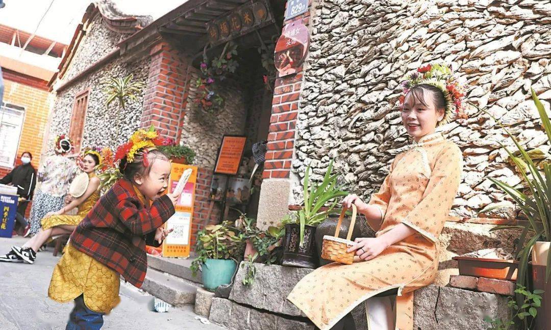 除了海边,蟳埔妈祖附近的蚵壳厝是人气最足的地方,这一带附近的巷子里,挤满了各个年龄段的游客,特别是有大面蚵壳墙的地方。大家都在各种拍拍拍,有的自拍,有的与好友们互拍,还有不少人带着摄影师随行。大家看着对方的造型,相互打趣着,一路走走停停拍拍,非常热闹。
