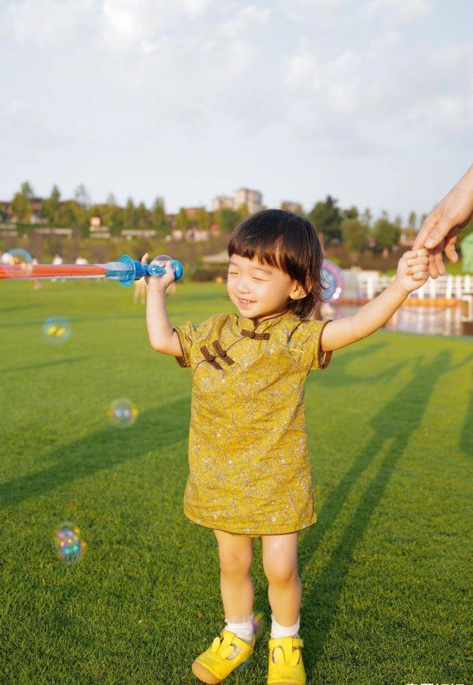 为了迎合节日的气氛,超可爱精心打扮了一番,今日穿了一件旗袍裙子,瞬间就变成了个小淑女。在草坪中,她一边玩泡泡,一边牵着爸爸的小手,小妞幸福地眯眯笑。看她那幸福的样子,就知道她多开心了。一个特别有意义的好日子。