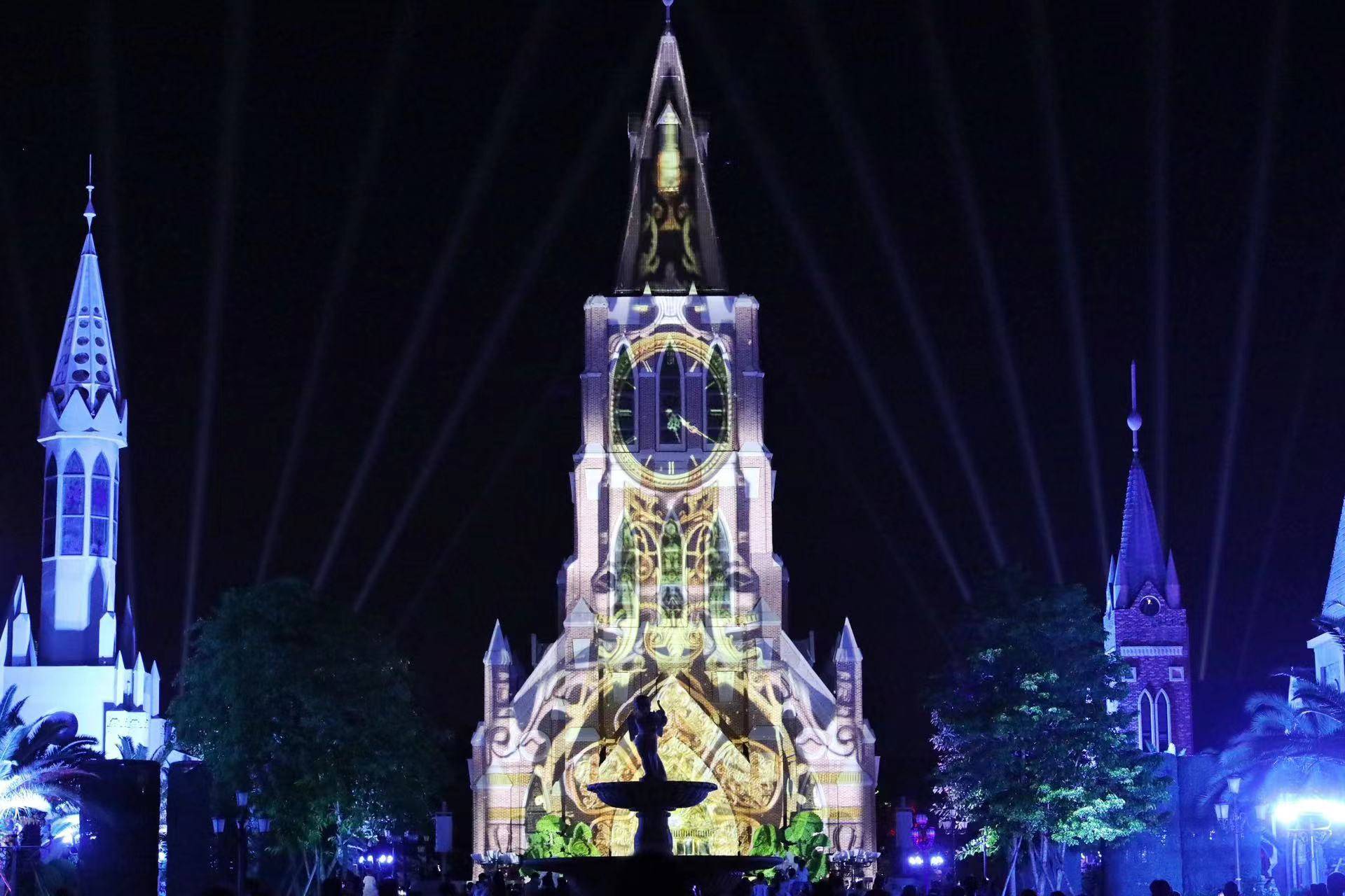 在优美的音乐声中,海花岛婚礼庄园内璀璨夺目的灯光秀准时开启。在流光溢彩的灯光秀中,各类建筑穿上了“绚丽”的外衣,夜幕映衬下,酷炫的光影效果令人陶醉。