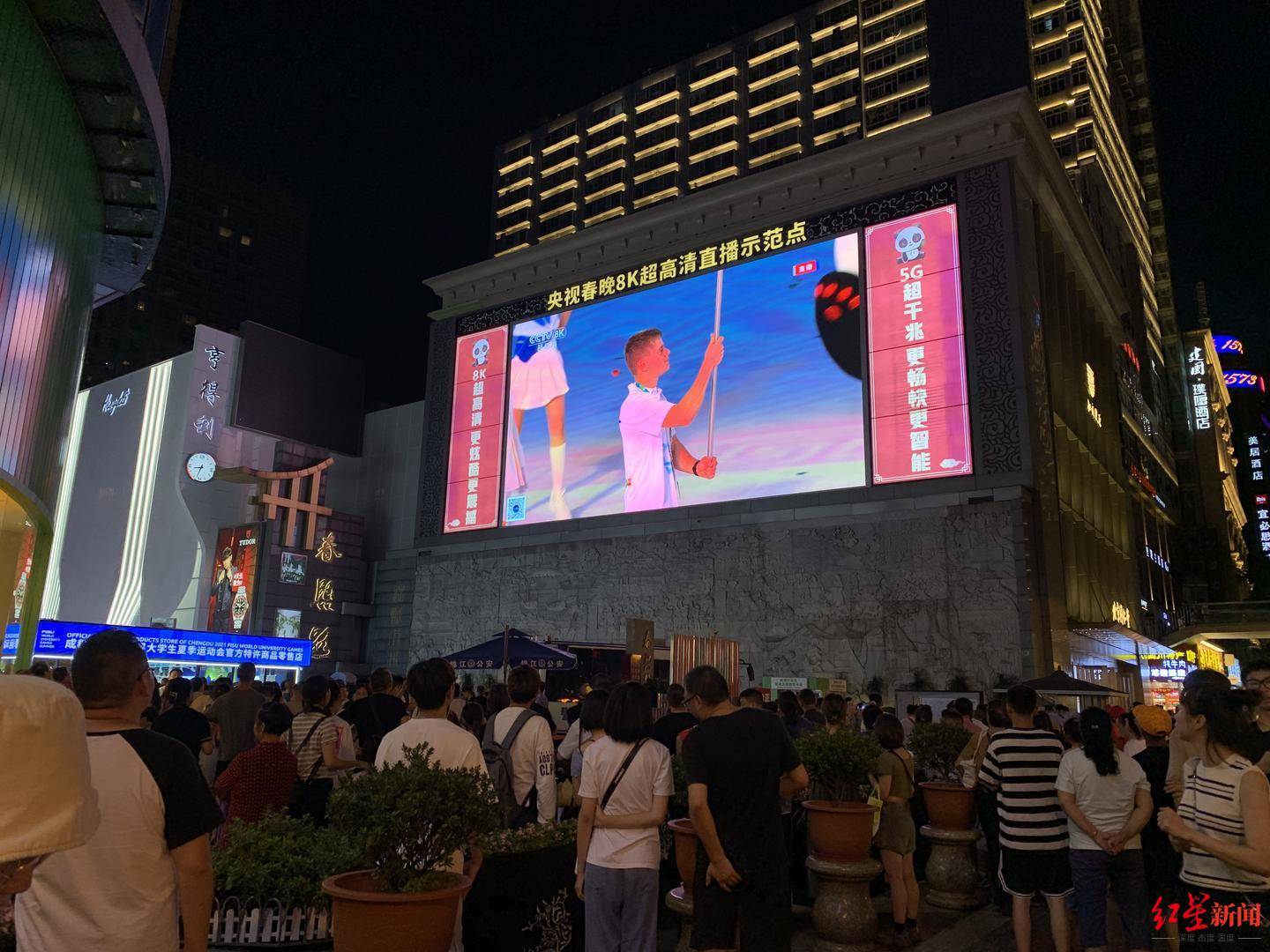 ↑7月28日晚,成都春熙路,人们正在驻足收看成都大运会开幕式直播