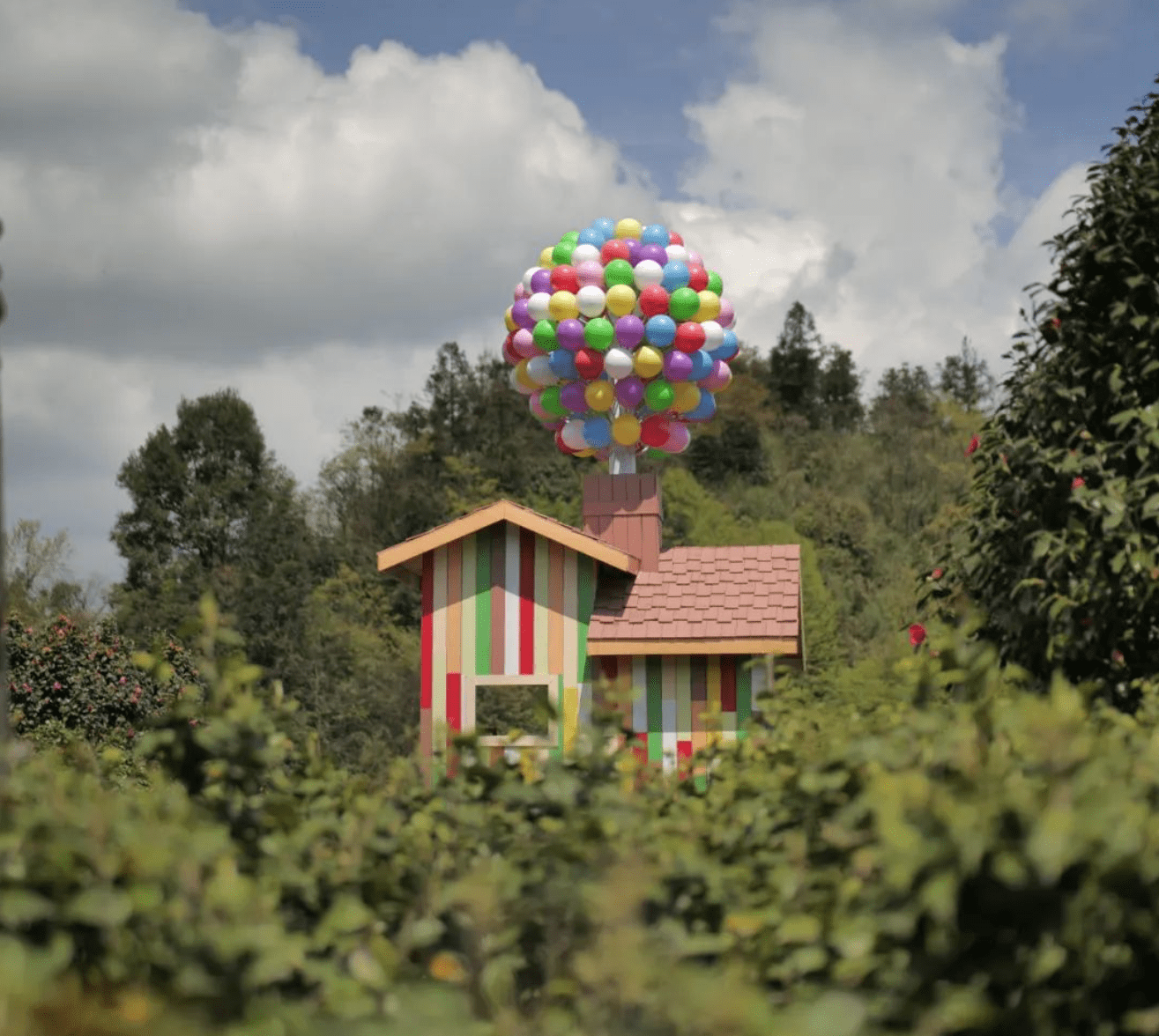 千亩花海深处还有一栋《飞屋环游记》的同款彩色木屋,是隐藏在丛林小径旁的惊喜,梦幻的色彩与山茶花海相映衬,上演一场春日童话~