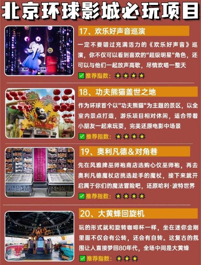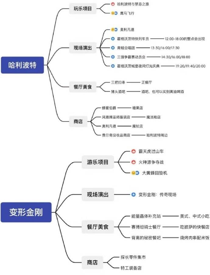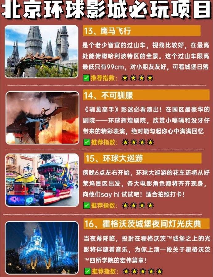 必打卡项目: 哈利波特·禁忌之旅→鹰马飞行→三把扫帚餐厅→奥利凡德→霸天虎过山车→变形金刚·火源争夺战→传奇现场→飞越侏罗纪→侏罗纪世界大冒险→奇遇迅猛龙→小黄人超级萌乐岛→神偷奶爸小黄人闹翻天→萌转过山车→功夫熊猫盖世之地→未来水世界特技表演→好莱坞区→不可驯服→环球大巡游→霍格沃茨城堡灯光秀→商店购物→城市大道