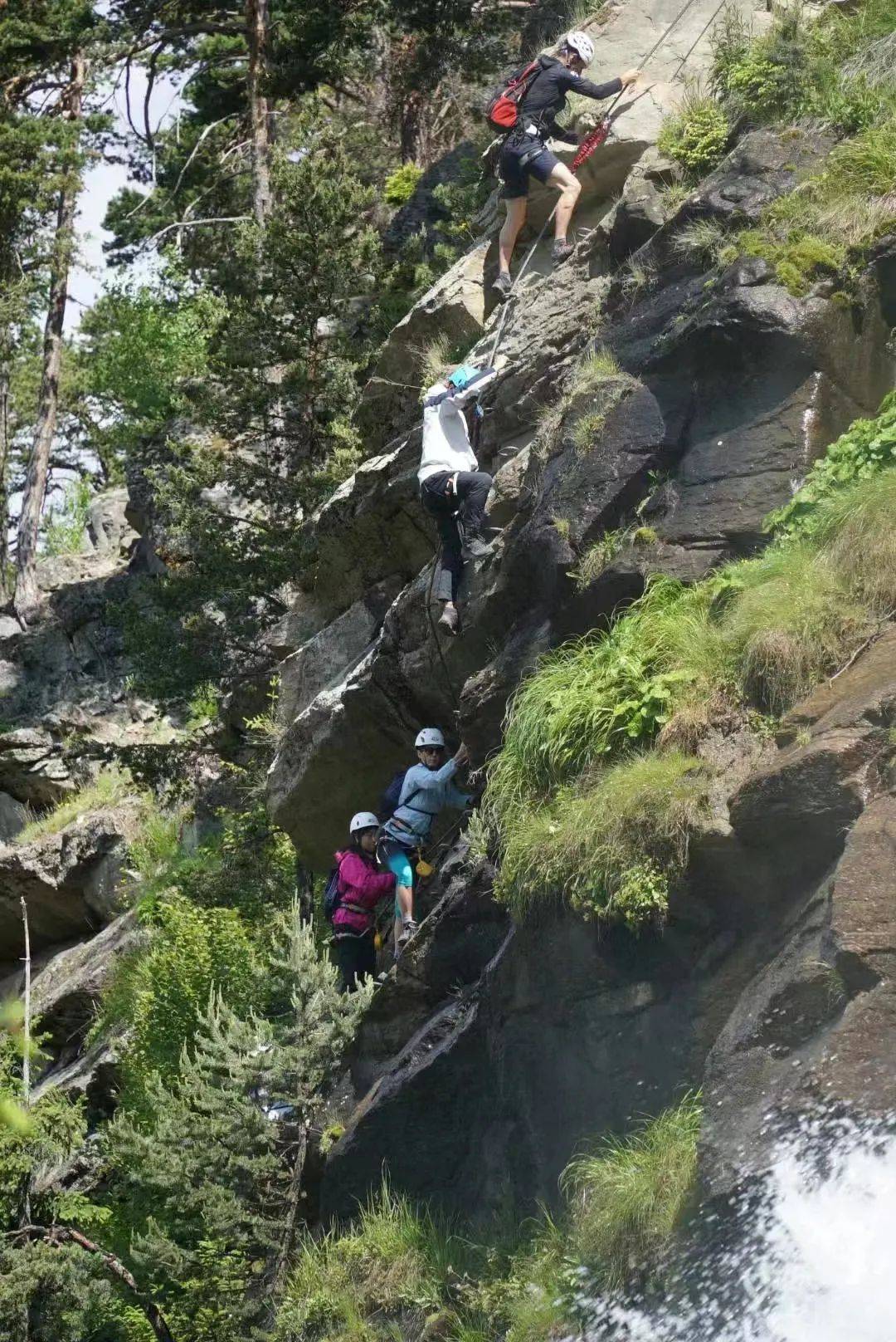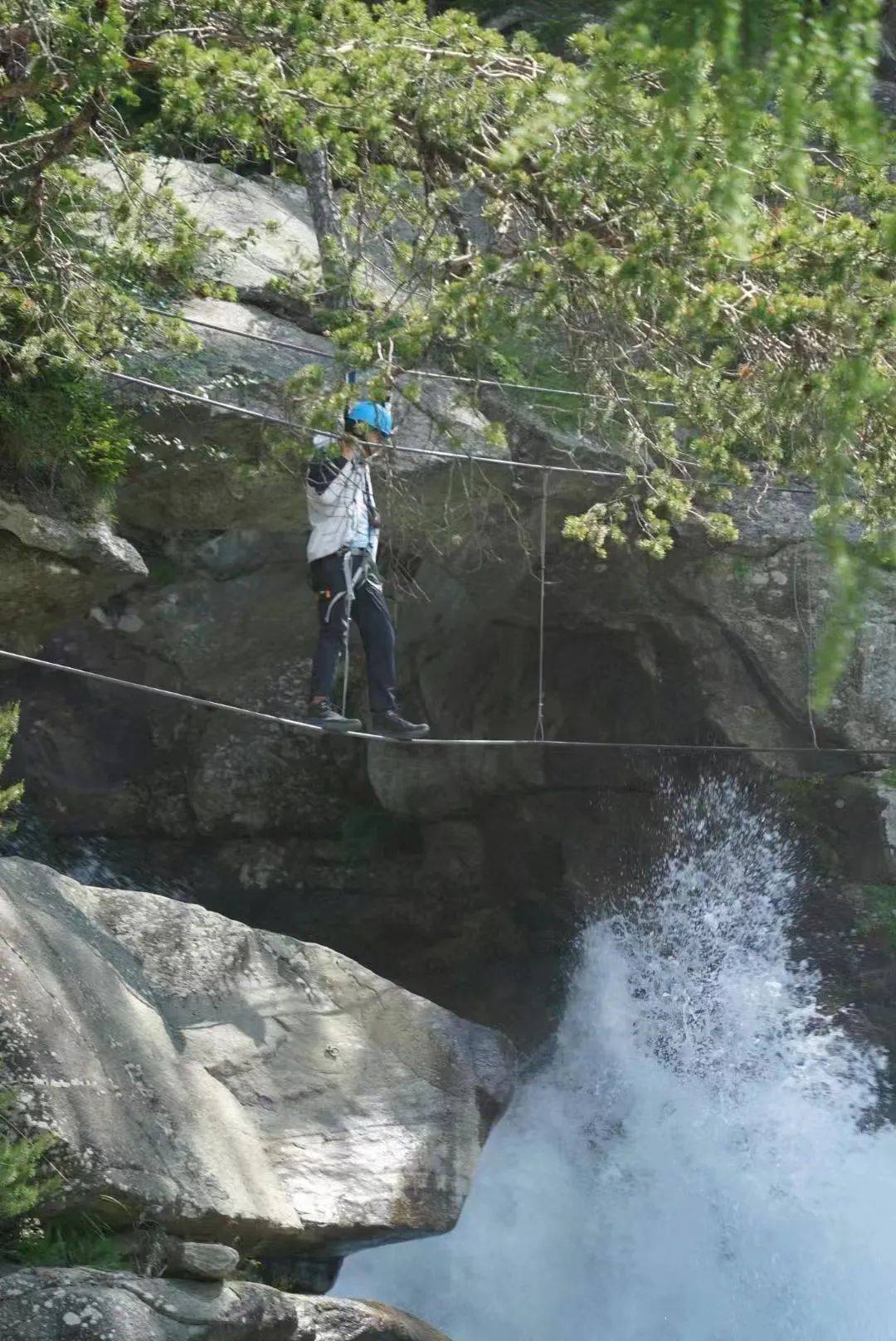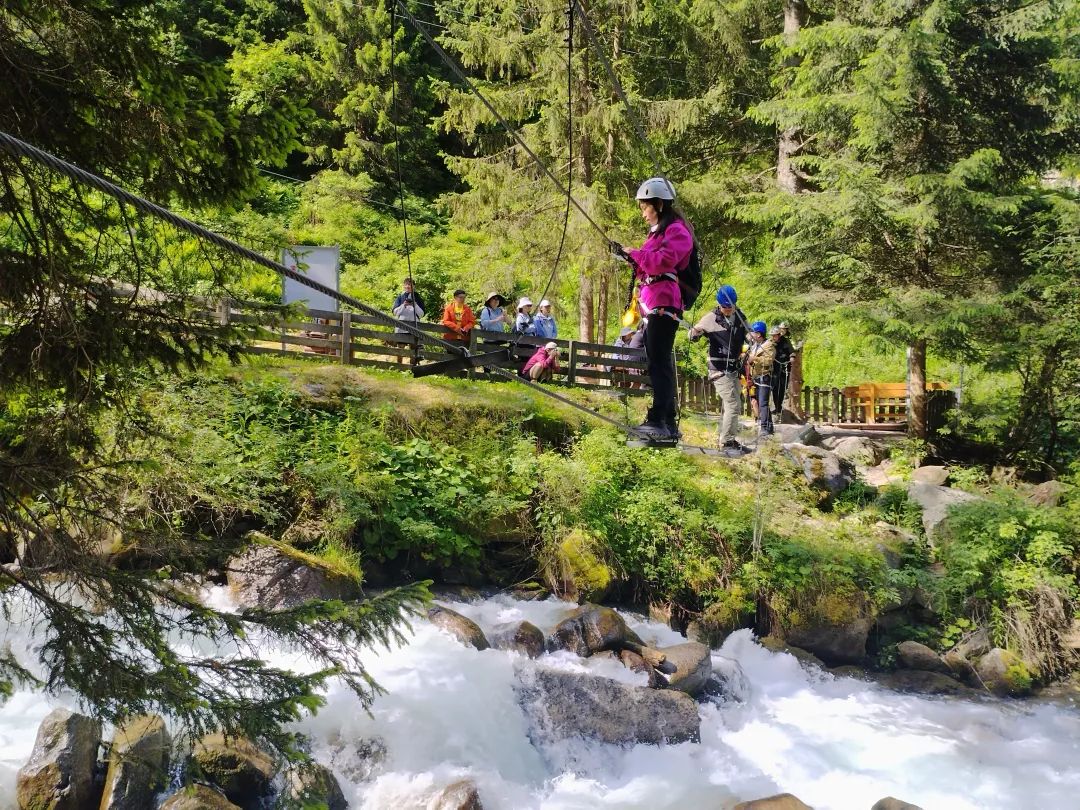 就在我还沉醉于对冰人奥茨的无限回忆之时,向导已经开始分发头盔、安全带了。我们到达今天飞拉达的起点,一条湍急的小溪旁,此前我曾经在儿子的陪同下练习了几个月的攀岩和抱石,我成了队伍中第一个吃螃蟹者,身形矫健的瑜伽练习者芭芭拉紧随其后。飞拉达的第一段就是脚踩单根钢索过河,虽然有安全带的保护,但是脚踩细细的晃动的钢索向前挪动还是挺考验心脏承受力的,惊险组的伙伴表现都不错顺利过了河。