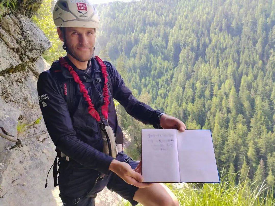 接下来就是大岩壁攀登,不是横移,就是垂直攀爬,有一段是接近90度的大直壁还带有点小屋檐,对胆量和体力都是不小的挑战。和高难度的自然岩壁攀爬不同,飞拉达全路段都有钢筋打制的脚点和手点,不是特别严重的恐高症患者,稍微有点体力大部分都能完成。来到一个自然形成的遮风挡雨凹槽处,向导神秘兮兮的打开了一个有盖的金属盒子。他从里面拿出了一个留言本递给了我,翻看了下五花八门的文字写了一大本唯独没有汉字。我认真的写下了第一条中文留言:攀爬至此,我们拥有了雄鹰的视角,鸟瞰大美阿尔卑斯群山!