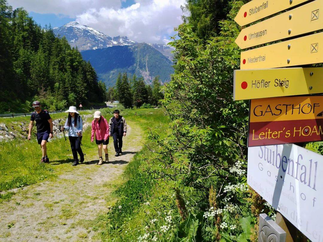 蒂罗尔州(Tirol)坐落在阿尔卑斯山脉中部,是欧洲最受欢迎四季皆宜的户外运动胜地,也被称为阿尔卑斯的心脏。早上五点多,我例行晨跑10KM打卡,见到了一队队起的比我还早的骑行者,见到了露营地里架着卫星电视接收装置的房车,后来咨询了欧洲露营老司机景曦大师才知道,有些露营者在营地一待就是几个月,其中很多都是保持着看电视老派爱好的长者。吃过早饭,向导来到酒店带领我们走路前往Stuibenfall瀑布,距离不远,有一大段都是我晨跑的路线。路上还遇到了几十个在老师的带领下进行森林徒步的幼儿园小朋友,奥地利的徒步人群果然是上至九十九,下至刚会走。