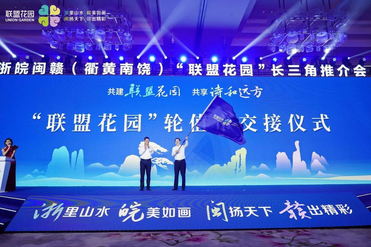 本次推介会进行了“联盟花园”轮值市交接,黄山市委常委叶建强从衢州市政府副市长徐利水手中接过了象征着四市合作共建的“联盟花园”旗帜。