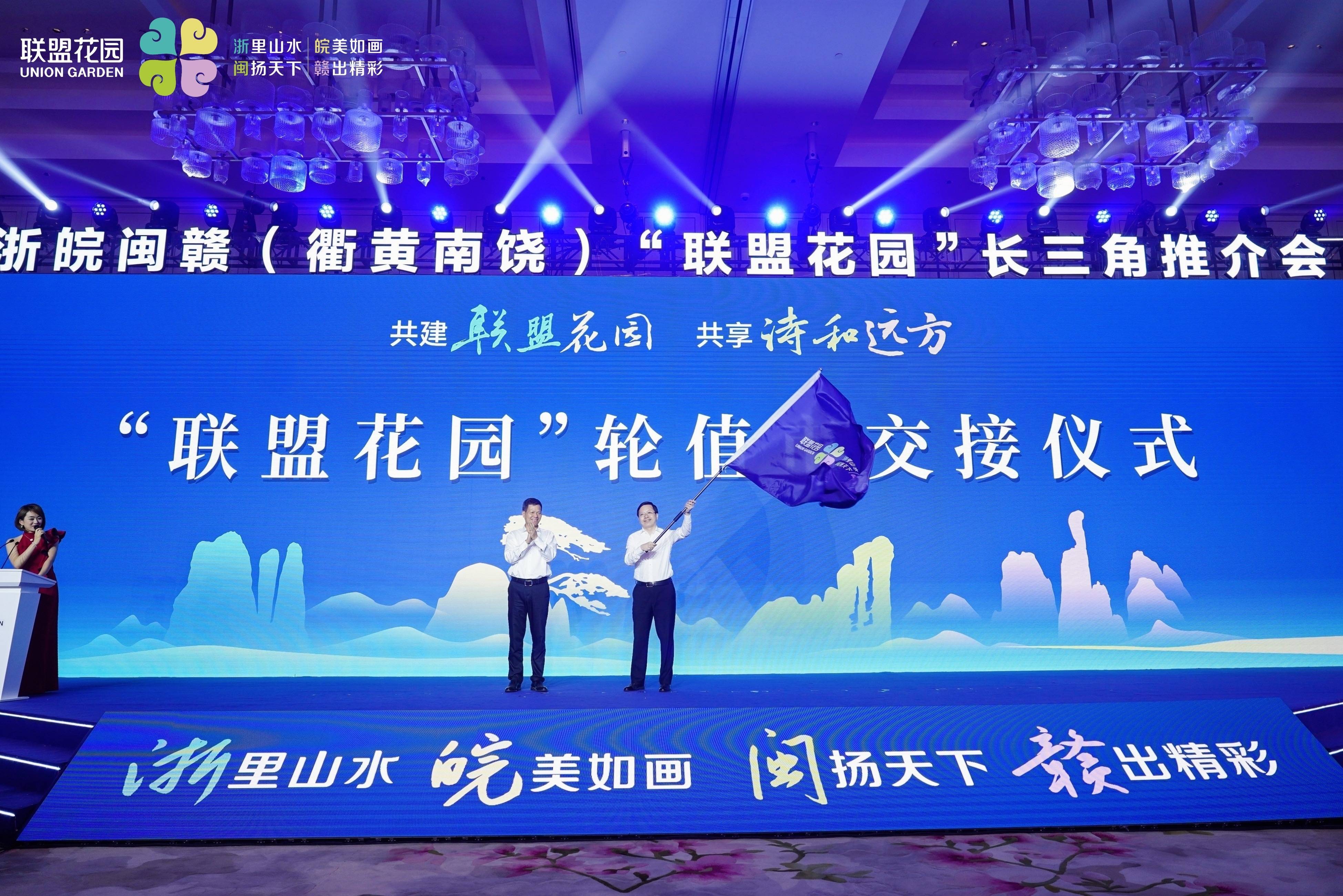 本次推介会还进行了“联盟花园”轮值市交接,黄山市委常委叶建强从衢州市政府副市长徐利水手中接过了象征着四市合作共建的“联盟花园”旗帜。