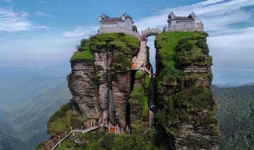 梵净山金顶海拔2494米,是武陵山脉的主峰。金顶所属山峰直立高达百米,中部一条裂缝将金顶一分为二,金顶的顶部两边各建有一庙,一边供奉释迦佛、一边供奉弥勒佛。