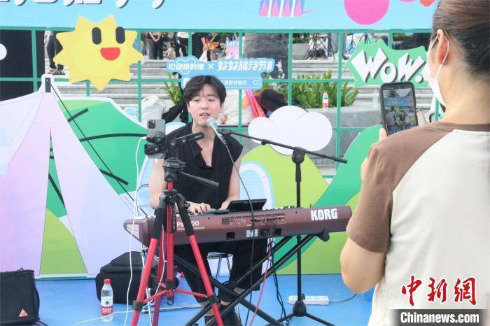 7月29日,一场直播嘉年华活动在三亚湾举行,才艺达人现场弹唱吸引市民驻足欣赏。张月和摄