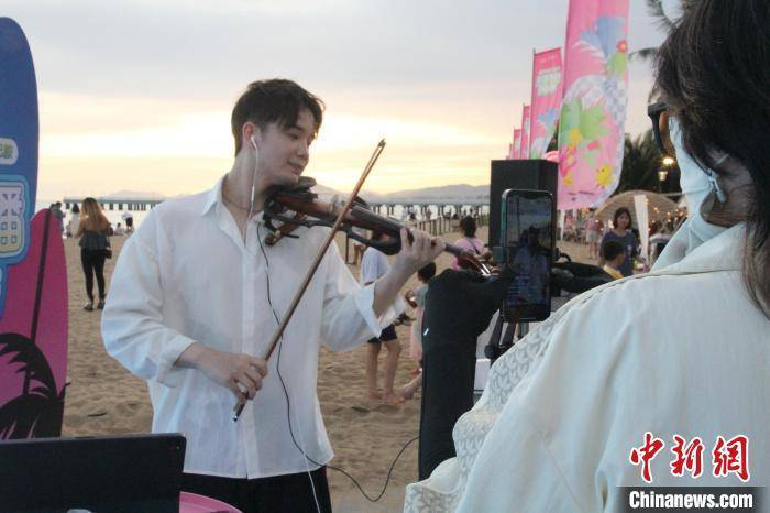 7月29日,一场直播嘉年华活动在三亚湾举行,图为才艺达人在海边演奏小提琴。张月和摄