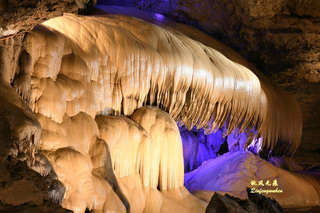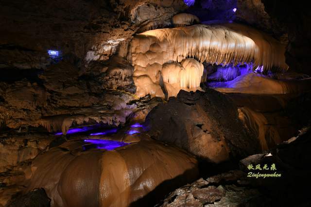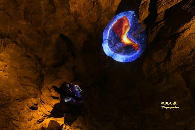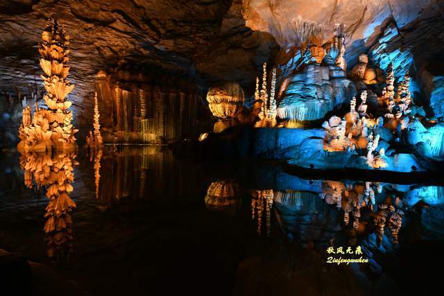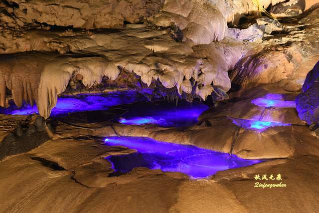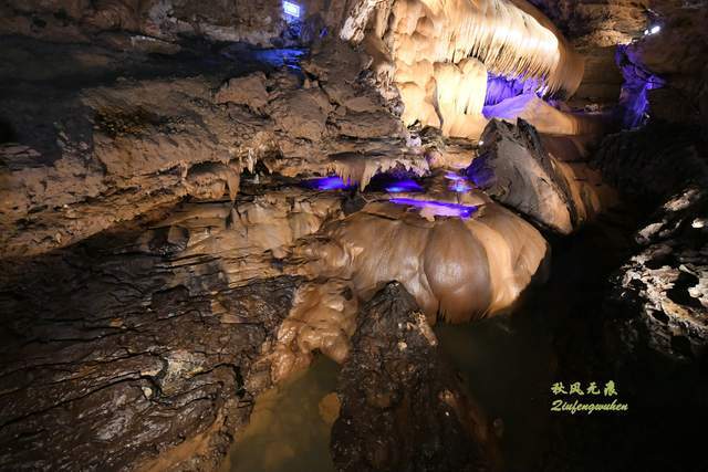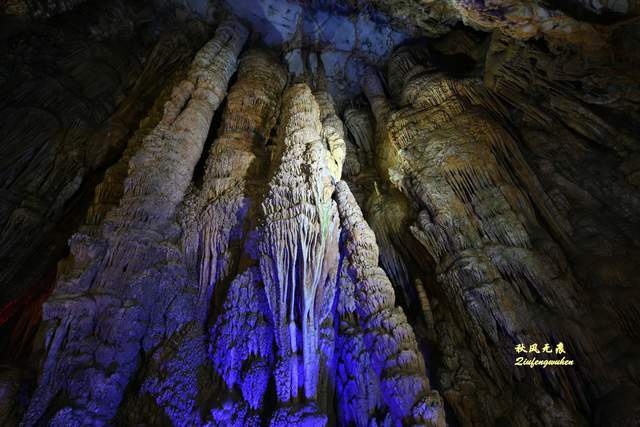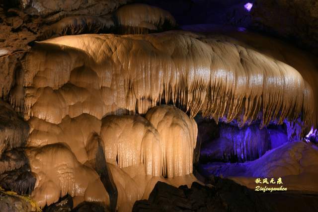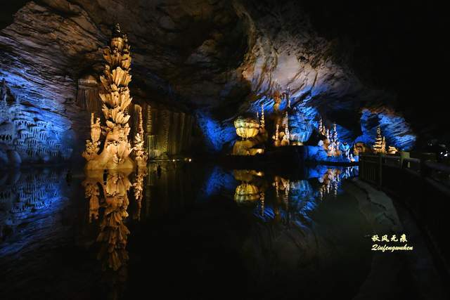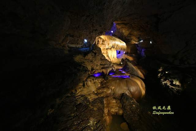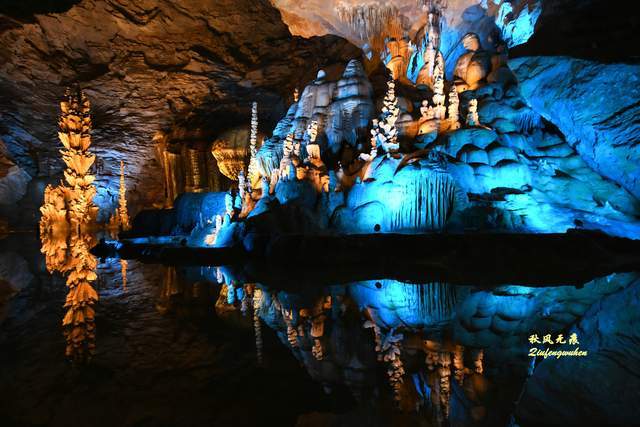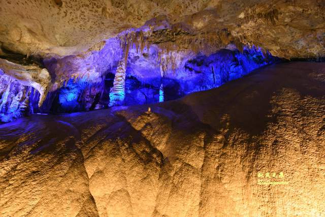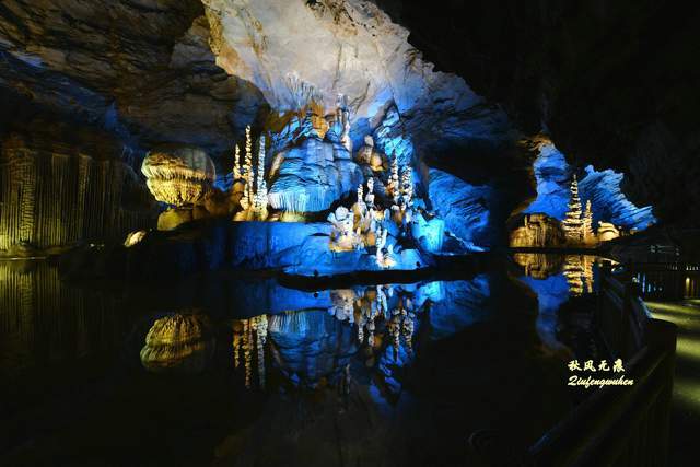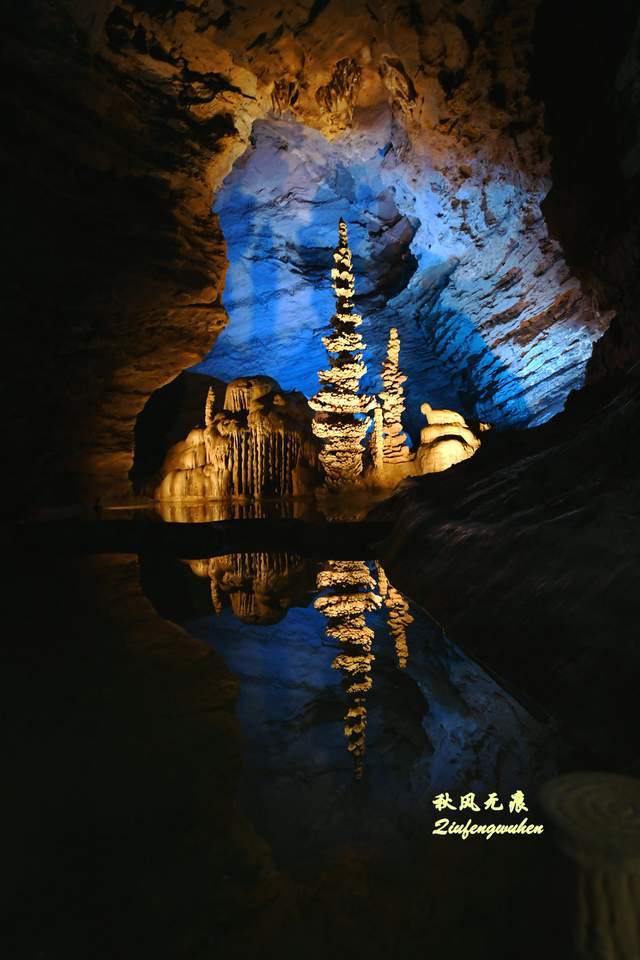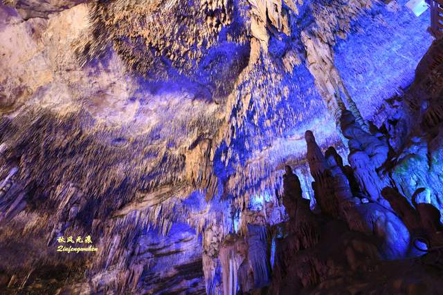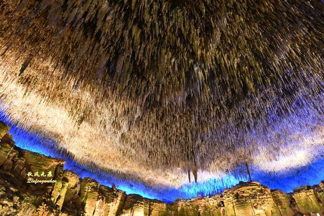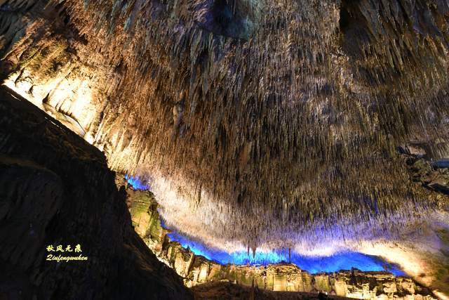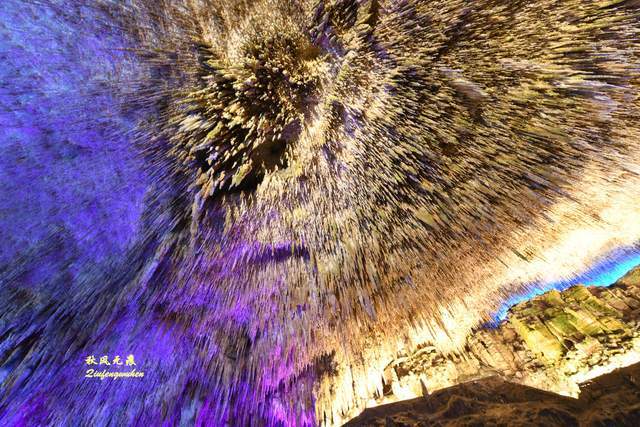 登上天宫胜景高处,最炫目的是亿万鹅管与城堡钟乳石形成的惊鸿一瞥,神奇的投光在鹅管群与城堡间透出蓝色的靓彩,就像苍穹与大地之间睁开的天空之眼,那惊艳之美,让人流连忘返,难以忘怀,画意里的无限意境,让人回味无穷。