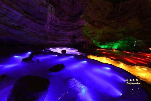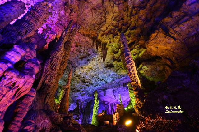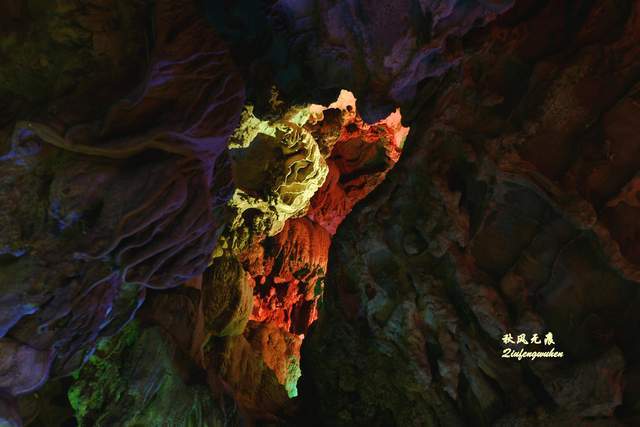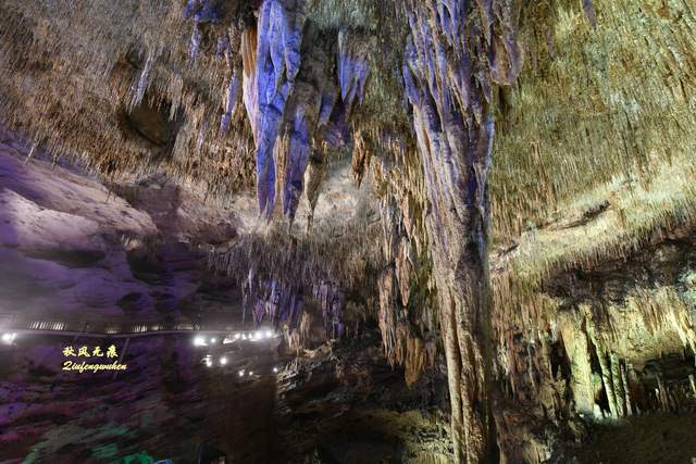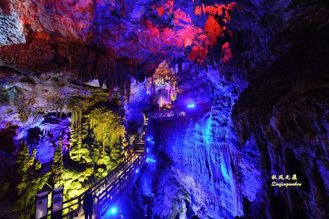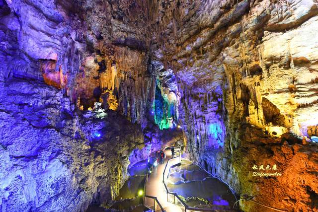 去往天宫胜景的道路,是一个蜿蜒的隧道,走在隧道的孩子心中,应该也是他们的步履一样充满急切的期待。路上的灯光在溶洞投下一抹抹靓彩,成为游览间隙的风景。