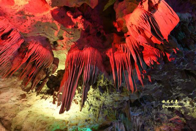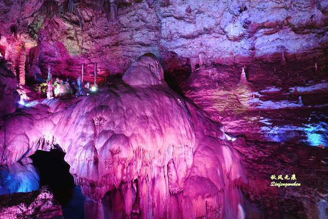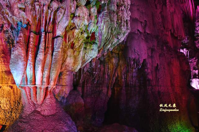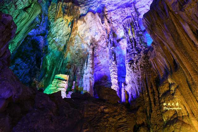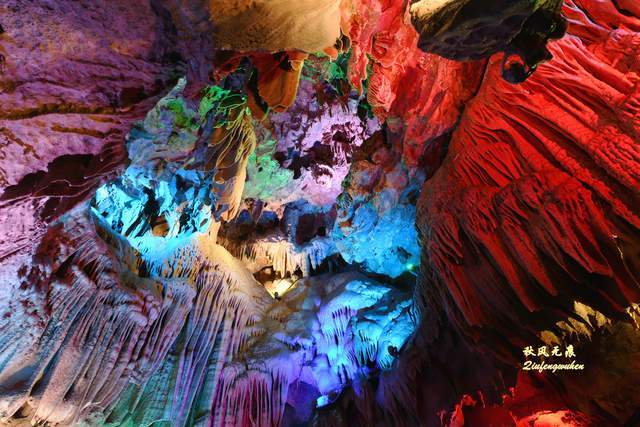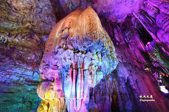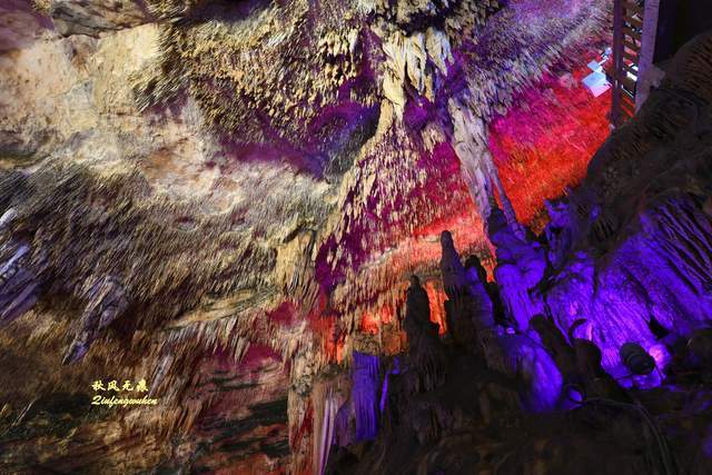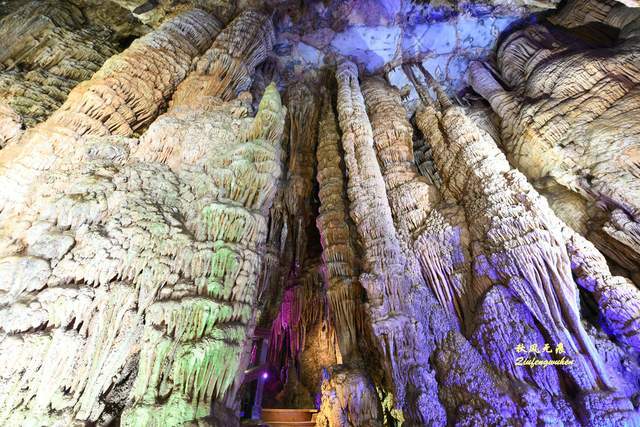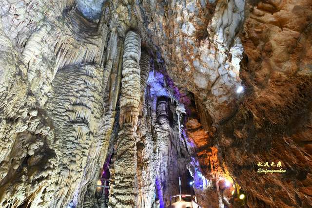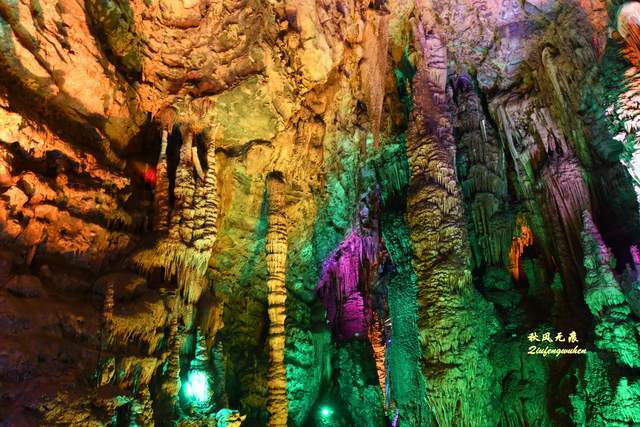 走出隧道,一个色彩绚丽的天宫胜景出现眼前,身边是一个个高低不同乳笋,洞的顶部挂满蜂状的鹅管,仰望里,一个个奇妙的钟乳石,像是诉说着亿万年的滴水故事,溶洞内变幻的霓彩,让钟乳石造型充满想象。