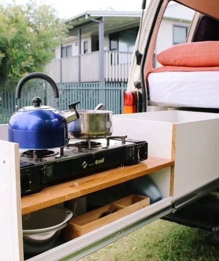 来到车尾,床铺下面是储物空间,有一个抽拉式厨具灶台,可简单做饭烧茶。