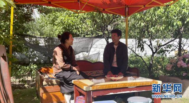 图为嘎拉村村民达瓦参坚和妻子在自家的院子里聊天,身后是小菜园和不同的果树。新华网 陈颖 摄