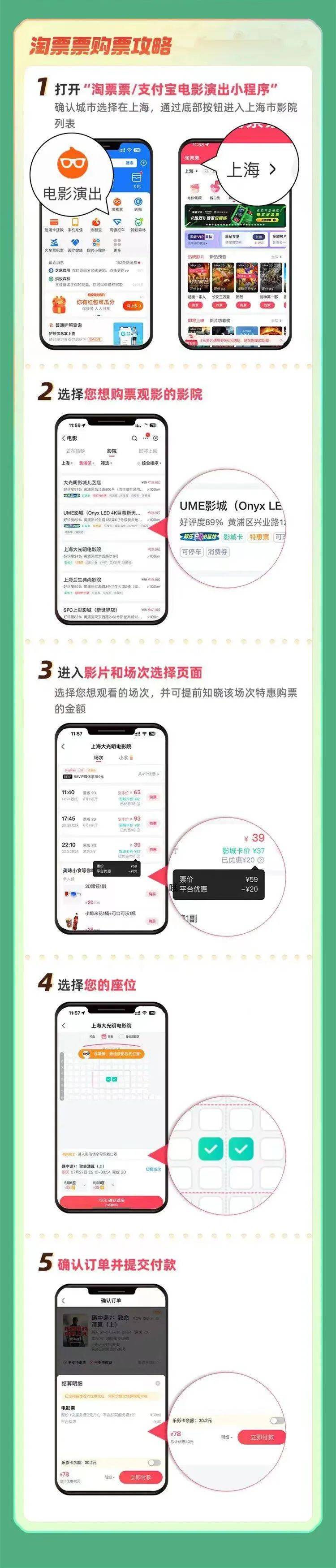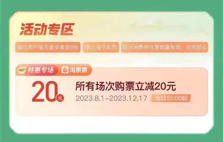 市民在活动期间登陆淘票票App、淘宝App淘票票频道、支付宝App淘票票小程序等淘票票相关平台,购买任意电影场次的影票,均可享受每张票直接立减20元的优惠。