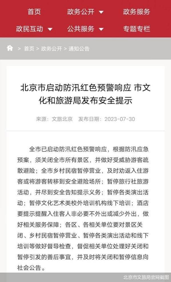 北京商报讯(记者 关子辰 牛清妍)7月30日,据北京市文旅局消息,全市已启动防汛红色预警响应,根据防汛应急预案,须关闭全市所有景区,并做好受威胁游客疏散避险;全市乡村民宿暂停营业,及时劝返入住游客或将游客转移到安全避险场所;暂停旅行社旅游活动,并尽到安全告知提示义务;暂停各类演出活动;暂停文化艺术类校外培训机构线下培训;酒店要提示提醒入住客人非必要不外出或减少外出,做好相关服务保障。