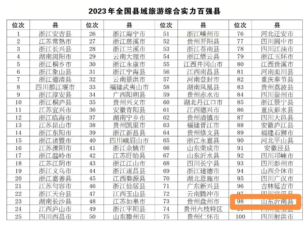 为继续全面、客观、科学反映我国县域旅游发展水平和质量,助力县域旅游持续回暖,全国县城旅游研究课题组、华夏佰强旅游咨询中心近日在京联合发布第五届全国县域旅游研究成果《全国县域旅游高质量发展研究报告2023》暨“2023年全国县域旅游综合实力百强县”“2023年全国县域旅游发展潜力百佳县”名单,山东省沂南县入选“2023年全国县域旅游综合实力百强县”,名列第98位。这是该县首次入选全国县域旅游综合实力百强县榜单,此前沂南县多次入选“中国县域旅游发展潜力百强县市”。