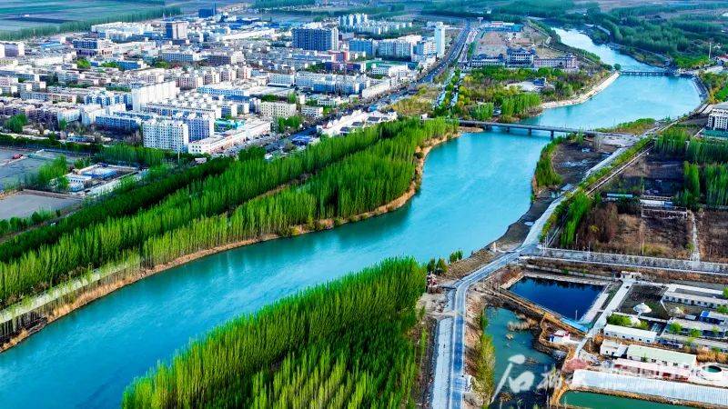 俯瞰博湖县开都河(4月13日无人机拍摄)。该县打造开都河生态文化旅游景区,将县城与博斯腾湖5A级旅游景区连成一线。