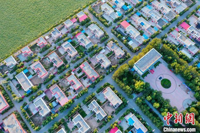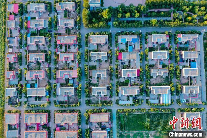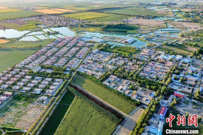近日,新疆昌吉回族自治州昌吉市六工镇十三户村,夕阳下整齐划一的村民住宅与连片的鱼塘良田相映成景,一副美丽乡村画卷。