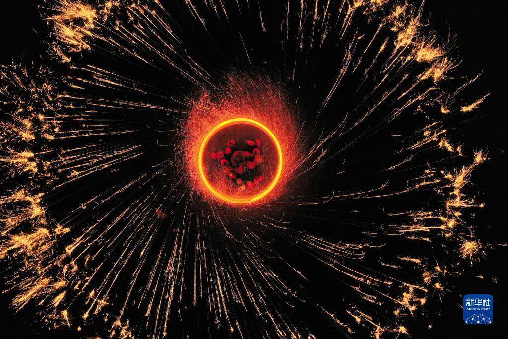 河北省滦平县火斗山镇大店子村的民间艺人在表演“抡花”(7月5日摄,无人机照片)。新华社记者 牟宇 摄