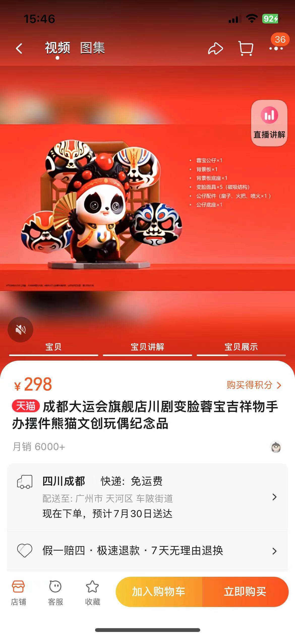 7月27日,大运会还未正式开幕,但大运会淘宝官方旗舰店里68元一件的蓉宝手办摆件,月销量就超过7000件;而298元一件的川剧变脸款蓉宝摆件,月销量也超过6000件。仅以上述两款蓉宝周边的销量计算,迄今,大运会淘宝旗舰店本月收入已超过200万元。