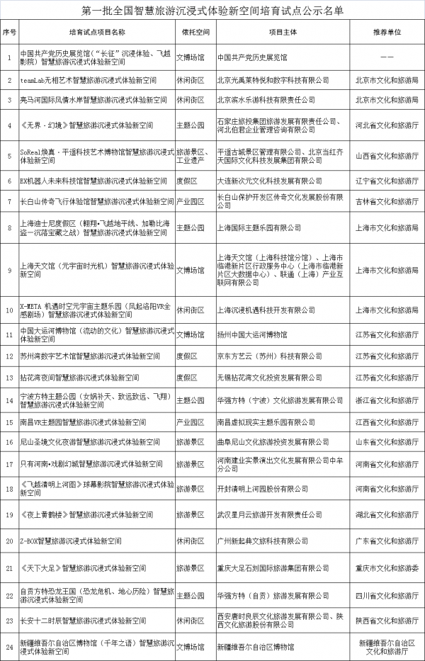7月26日,文化旅游部发布《关于第一批全国智慧旅游沉浸式体验新空间培育试点名单的公示》,公示内容如下: