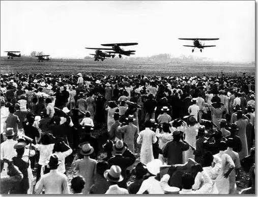 1934年4月,虹桥机场再次征地890亩进行扩建,在1931年到1934年间,这里是欧亚航空公司枢纽机场,下面这是一张1932年10月上海虹桥机场当地群众聚集观看起降飞机的老照片——
