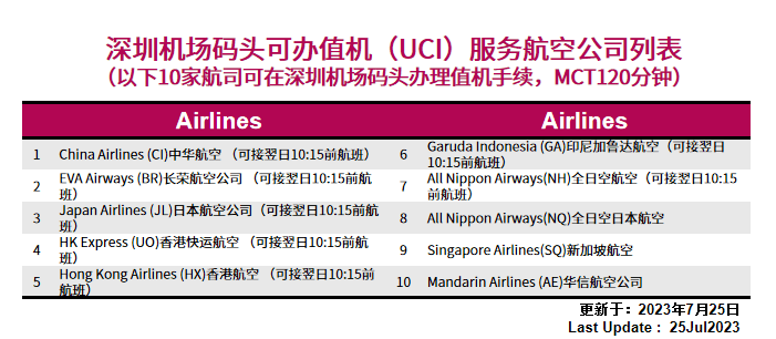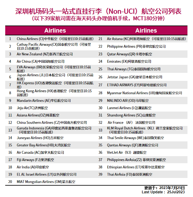 截至7月24日,共有67家航空公司参与深圳机场码头空海联运服务。其中目前10家航空公司可在码头办理值机手续,39家航空公司可在码头办理行李直挂手续,后续将持续更新。
