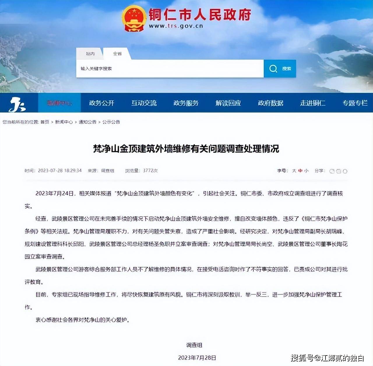 事件败露之后,梵净山管理局副局长、规划建设管理科科长、武陵区景区管理人员总经理等人免职并立案审查调查,对梵净山管理局局长、武陵景区管理公司董事长立案审查调查。