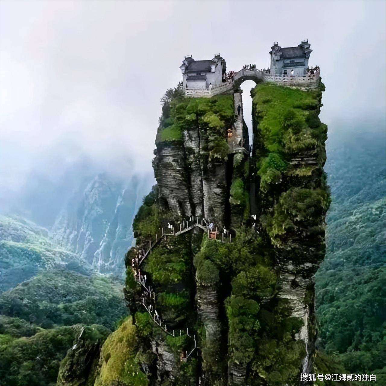 经历了岁月的摧残,梵净山金顶寺庙只是有外墙脱落的情况,可是遭遇有心人的精心设计,将它换了一个模样,远远望去,山峰之前出现两个少女,彻底推翻了此前庄严的形象。