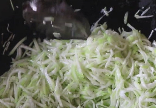 接下来就把新鲜的葫芦瓜去皮切丝,下锅稍微炒软出水后,这就可以放到米浆里一起搅拌均匀了,然后热锅烧油,把米浆倒入大锅里摊平,煎到一面熟透之后,用刀划成小块,逐个翻面再煎,像这样煎到两面金黄,葫芦粄也就熟透了,看卖相这是很不错的。