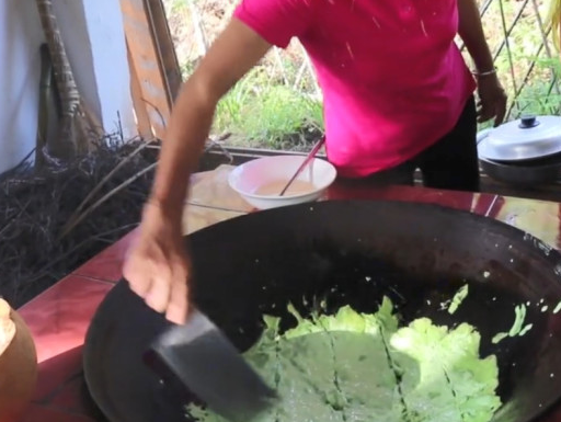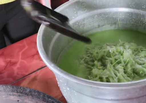 其实“粄”在江西赣州是一种很常见的美食,原料一般都是大米,而且做法花样百出,每一种“粄”的口味都不同,比如说碗粄、萝卜粄、艾粄等等。而这种葫芦粄的原料当然是大米、葫芦啦,首先把浸泡过的大米同韭菜一起打成米浆,这样的粄吃起来会更香一些。