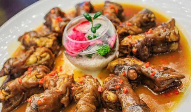 尤其是面对红扒山竹鼠,很多不了解情况的游客,一听到是老鼠,便忍不住心生反感,心想这玩意真的能吃吗?其实竹鼠与我们平时所看到的老鼠完全不同,全南的竹鼠不仅完全由人工饲养,味道那更是一绝,令人回味无穷啊!虽然刚开始吃的时候,我心里也有点犯怵,尤其是看到竹鼠的尾巴和四肢后,那更是不敢下筷。不过有了第一个吃螃蟹的人,自然就有第二个,看着身旁的朋友吃得那叫一个香,我终究还是忍不住对美食的好奇,小小地尝了一口,然后就是大型真香现场了。味道有点像我们平时吃的主角,不过相对于猪脚而言,竹鼠的肉质要更为细嫩一些。
