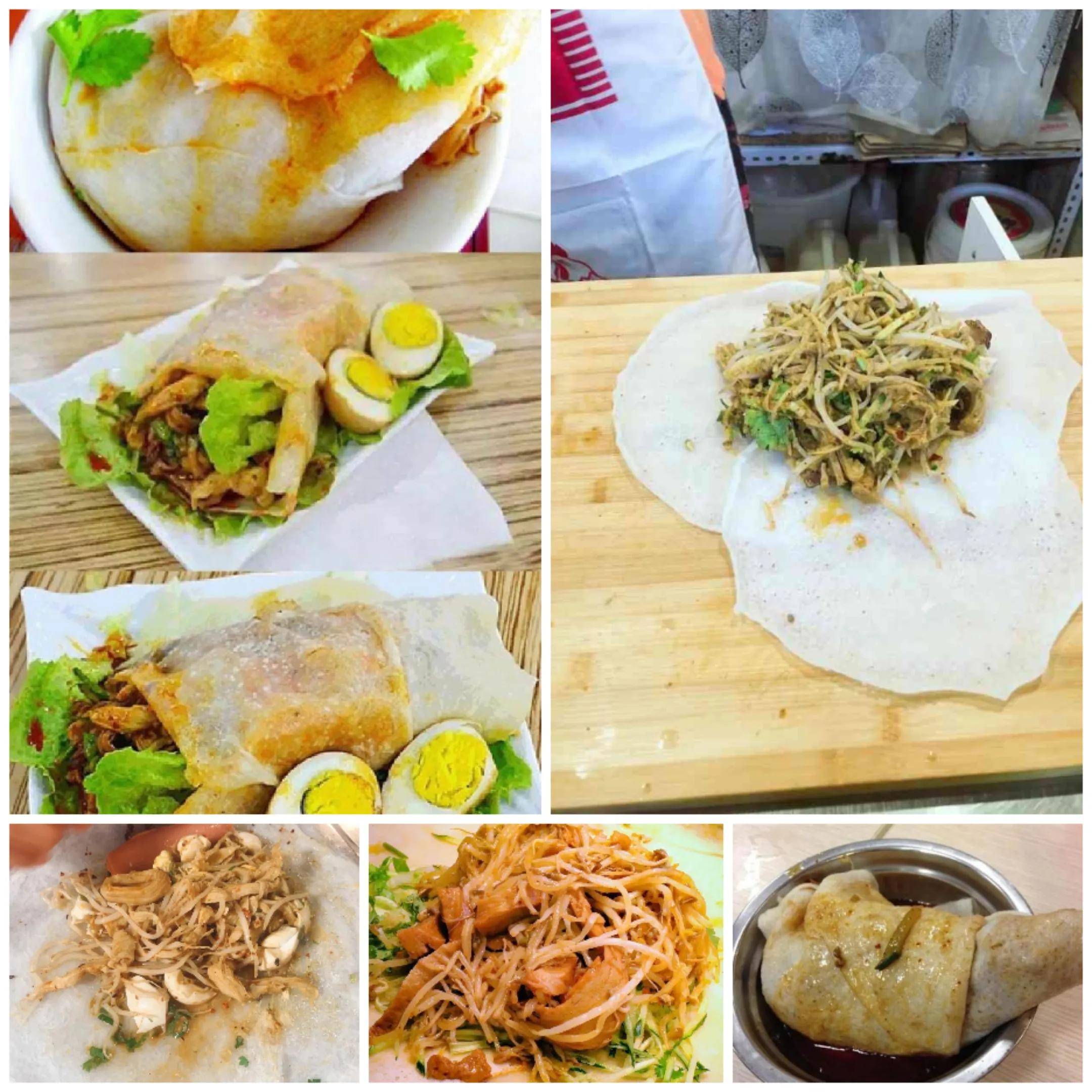 面筋、豆芽在沸腾的铜锅里熬煮,满满地浸入料的香味。香软的馍皮里包裹着清爽的豆芽菜、筋道鲜香的面筋,加上碎碎的卤鸡蛋,卤肠,再根据口味加入辣椒、蒜、香菜等,卷起来后再蘸一下锅里的高汤,鲜香味浸入馍皮,这就是阜阳临泉的田三卷馍。