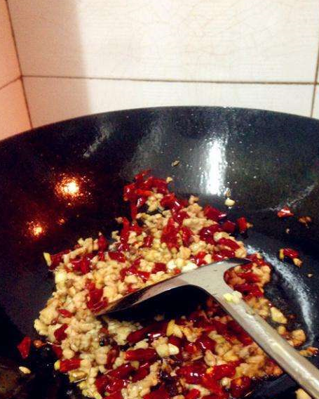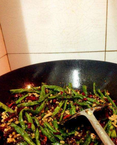 第三步:锅里加少许油把肉末炒熟加蒜末炒香,加干辣椒,花椒炒香,加炸好的四季豆翻炒,再加盐,味精调味,再翻炒几下就可以出锅了。