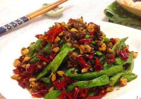 用料:四季豆500克,肉沫50克,蒜沫,盐,味精,干辣椒段,花椒适量。