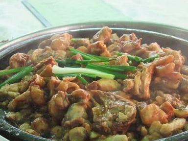 4、准备砂锅一个,将炒好的半成品倒入,进入适量水(以刚没过鸡肉为最佳),再加入少许食盐。中火慢慢焖。