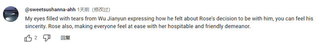 当吴建云说出罗斯同意和自己恋爱时的感受,我的眼里噙满了泪水,你真的可以感觉到他的真心实意。罗斯也是如此,她的热情友善让每个人都感到轻松自在。