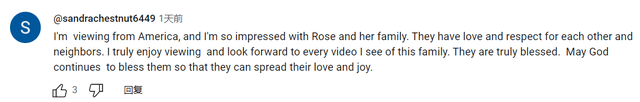 我正在美国观看这个视频,罗斯和她的家人彼此相爱,相互尊重,邻里和睦,给我留下了深刻印象。他们的每一个视频我都喜欢看并期待着更新。这个家庭真的很有福气,愿上帝继续保佑他们,让他们能够传播爱和快乐。