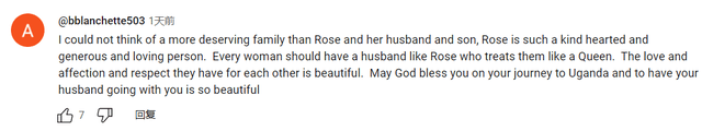 罗斯和她的丈夫、儿子组成的这个家庭是世上最幸福美好的了。罗斯心地善良、慷慨大方、乐于助人。并且每个女人都应该像罗斯这样有一个好丈夫,像对待女王一样对待她们。罗斯一家彼此关爱、牵挂、尊重,是如此的美好。愿上帝保佑你的乌干达之旅顺利,有你的丈夫与你同行是多么幸福啊。