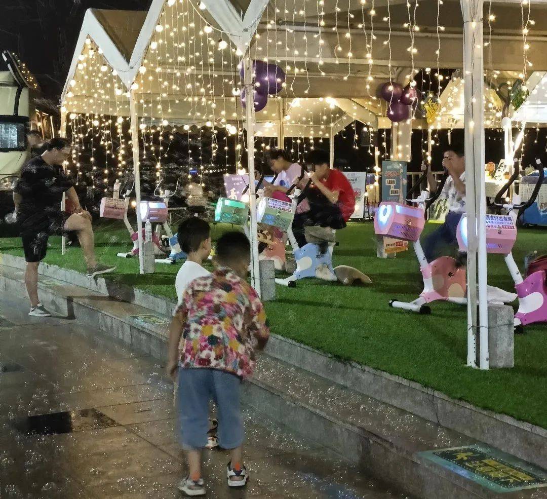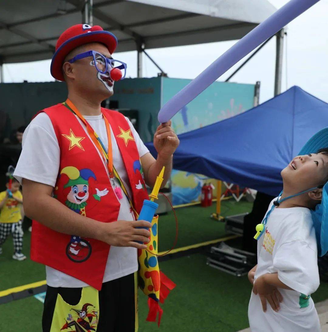 啤酒节还为小朋友准备了童玩泡泡机。 脚踩踏板,转动轮子,就能飞出无数个精灵泡泡。在灯光的照耀下泡泡变得五彩缤纷,没有一个小朋友能拒绝这种快乐。还有穿着大皮鞋、戴着红鼻子的小丑叔叔,为小朋友们分发气球。