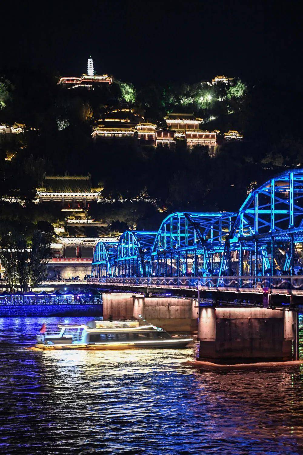 这是7月26日在黄河兰州段白塔山下拍摄的灯光璀璨的白塔山码头。新华社记者 范培珅 摄