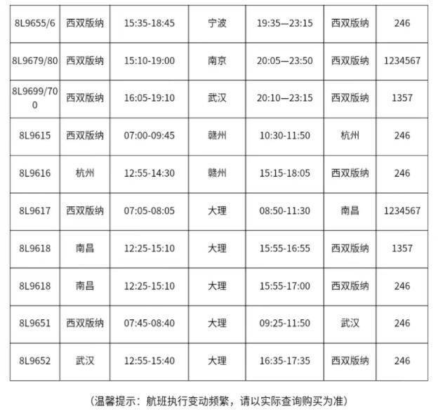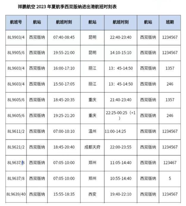 据了解,祥鹏航空在夏航季开通了多条直通西双版纳的省内外航线,销售价格400元起,助力游客便捷出行。同时,为便利沪丽两地往来互通,祥鹏航空计划于2023年4月10日开通丽江直飞上海浦东航线,周一至周日每天执飞1班,去程丽江起飞时间为16:35,到达上海浦东时间为20:10,返程时间为21:25,到达丽江的时间为次日凌晨01:00。具体航班信息、价格以实际查询为准。