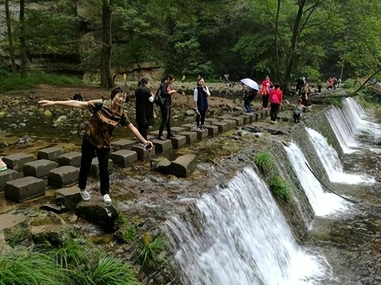 鞭溪的绿色像一个染缸,山是绿的,水是绿的,天是绿的,连河里的石头也是绿的。这些石头在潮气与水气的长期熏陶下,适应了环境的生长,他们在浅水中发芽,在石头上定根,把金鞭溪染成了绿色海洋如风景走廊。