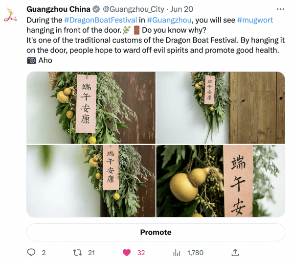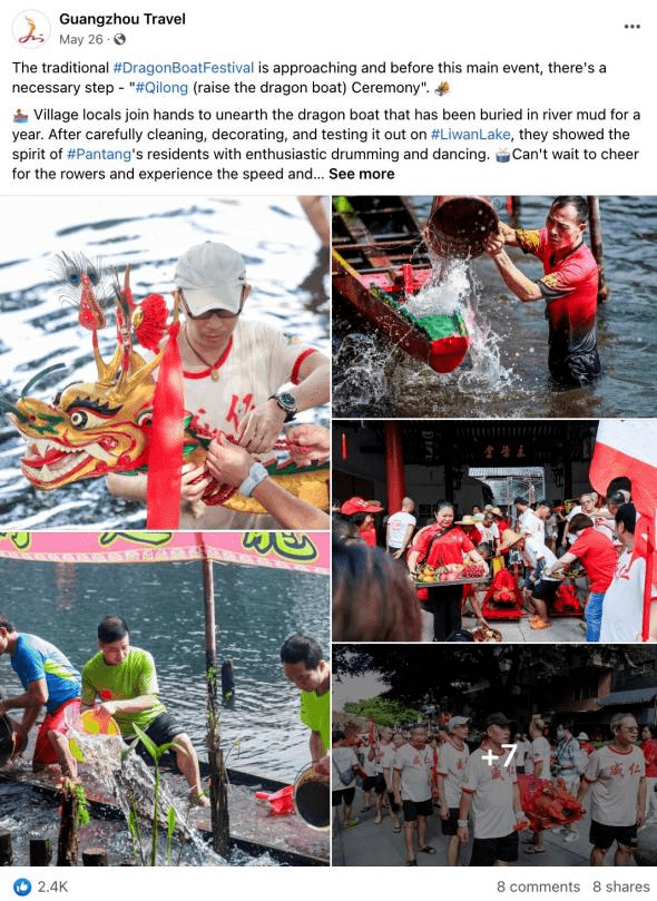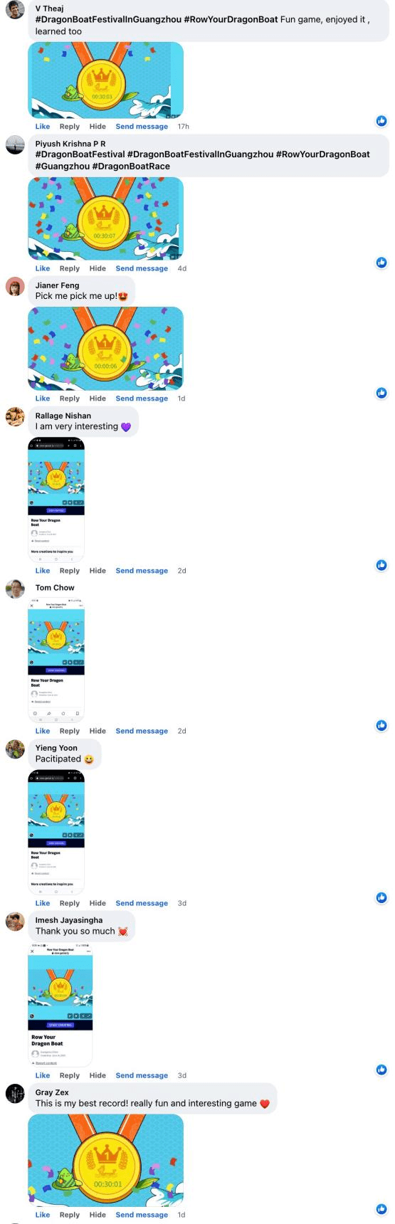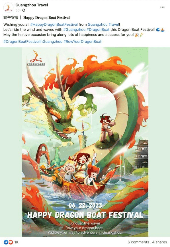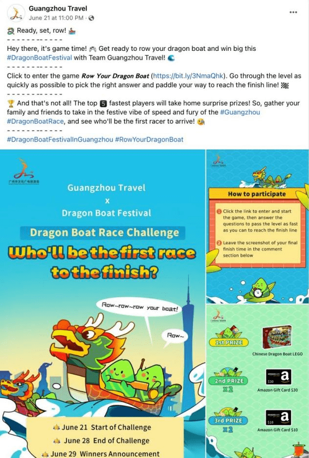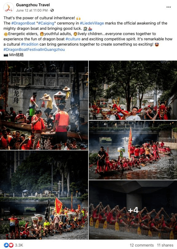 广州龙舟文化蕴含了广府水乡人繁衍生息的历史,恰逢端午降至,广州文广旅海外社媒账号围绕“五月五·过端午”在Facebook和Twitter平台策划了系列主题帖文,整合了广州多区的龙舟习俗;并在海外社媒平台开展#RowYourDragonBoat的互动游戏,寓学于乐,吸引海内外用户更好探索这一传统节日的文化色彩;“五月五·过端午”主题系列总共推出了10期贴文,系列贴文覆盖近19.3W人次,参与互动近2.8W人次。